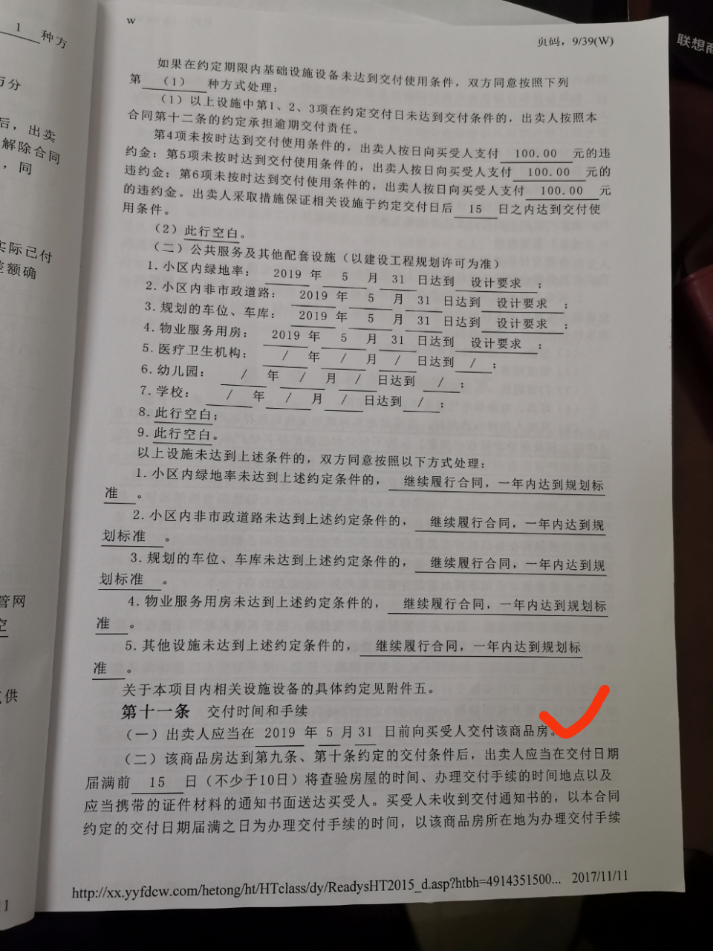 LS: 我于2017年11月份购置佳利·壹品苑商品房并签订购房合同,合同约定2019年5月31日交房,并约定如逾期交房,则每天赔偿房屋总价的万分之一违约金。2019年12月1日,我收到壹品苑开发商寄过来的收房通知单,告知12月2日-8日办理收房手续,12月2日来营销中心对接,咨询逾期交房赔偿问题。开发商直接口头告知,逾期交房不是他们的问题,是政府导致的,现在只能按80天逾期赔偿,如果接受,则签字确认收房;如果不服,可以通过法院处理,我们接受法院判处结果。于是,交房不欢而散。 对此,我有如下几个问题请求政府相关部门处理: 1、交房时间及达标问题:11月30日开发商寄出交房通知单,该楼盘是否已经在11月30日前已经办理了全部的竣工验收资料(取得三书一证一表)达到了收房条件?如果存在提前告知嫌疑,相关职能部门是否有相应行政处罚? 2、交房手续问题:正常交房手续是否有必须接受开发商当前不对等违约赔偿才能办理交房?如不接受,开发商单方面告知逾期默认收房是否合规? 3、逾期交房赔偿问题:合同明确约定5月31日交房,截止到12月1日,逾期已超过180天,开发商一则口头说是政府方面导致逾期,二则只愿意按80天逾期计算。请问这种口出狂言给政府扣帽子的说法,我们只能是接受或者通过法院处理吗?对于这种毫无信誉的开发商,相关主管部门是否可以直接用行政手段要求按合同处理? 附件1:222.jpg 附件2:333.jpg 附件3:444.jpg 附件4:555.jpg |