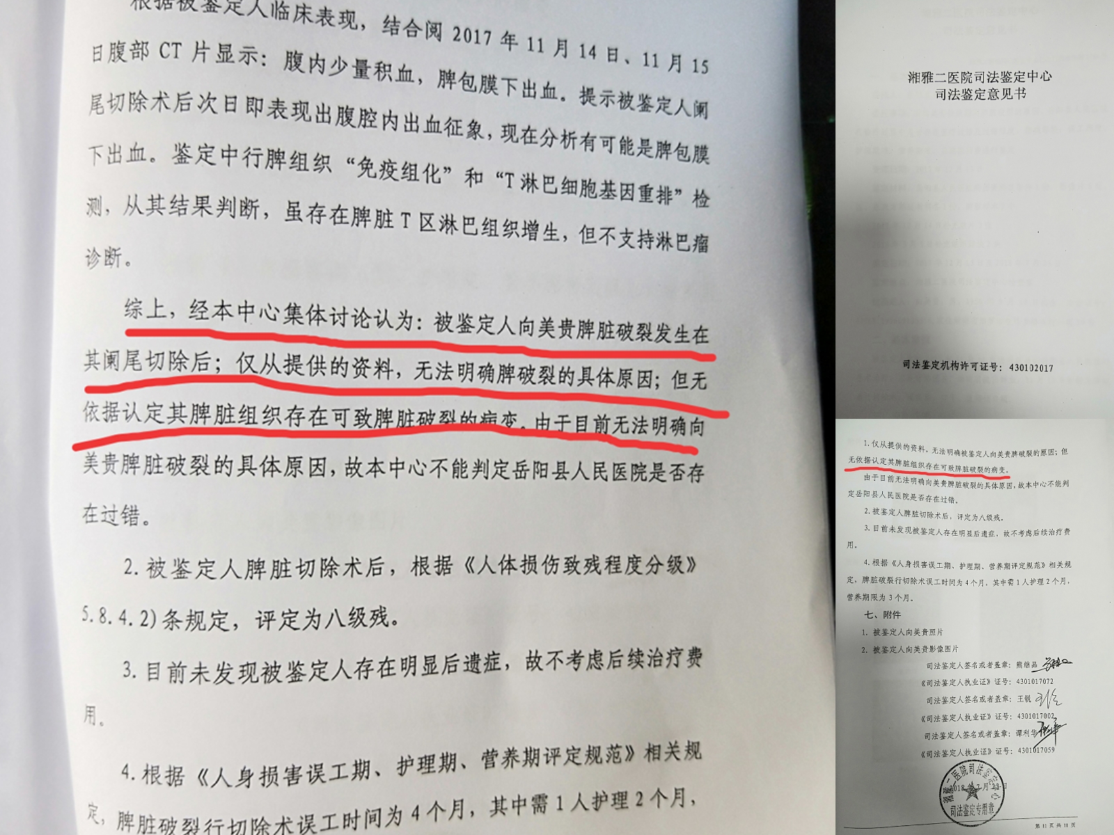尊敬的县长及各政府领导: 您好。感谢您查看此邮件! 从家庭纠纷、安全事故,再到“假疫苗”事件;每一个事件对大众或家庭都会造成很严重的影响。以下是发生在我表姐身上的重大医疗事故: 【一】医疗事故简述 患者:向米贵(表姐的父亲) 电话:13707407217 内容:患者到岳阳县人民医院就医,经确认为急性阑尾炎;自术后,盆腔导流管开始不明原因的流血不止,腹腔镜探查,探查见脾脏破裂,后再次进行切腹手术将脾脏切除。后将脾脏送长沙金域检验未发现脾脏有任何病变,且阑尾炎手术前未发现有其他异常。讨要说法,医院的态度也着实让人心凉! 【二】医疗事件详细过程: 我的父亲向米贵2017年11月10日晚因腹痛入岳阳县人民医院急诊,11日转住院部,经人民医院做B超、CT诊断为急性阑尾炎,其它器官并无任何问题。且在当日进行阑尾切除手术,自术后盆腔导流管开始不明原因的流血不止。11月15日对我父亲进行腹腔镜探查,探查见脾脏破裂,后再次进行切腹手术将脾脏切除。17日将脾脏送长沙金域检验未发现脾脏有任何病变。医院态度也着实让人心凉!我们向法院起诉后,法院委托长沙湘雅二医院司法鉴定中心进行鉴定,脾脏样本及所有资料、图片全部移交鉴定中心,给出的结果是破裂发生在阑尾手术后,排除病理性破裂。 医院态度一直很嚣张也很差劲,我不愿与医院私下解决,只因像我们这样的案例不在少数,不想纵容了他们!作为弱势群体,只能向政府各位领导寻求帮助。希望能得到一个公平公正的对待! 附件1:术后缝针照片-无摔伤痕迹.jpg |