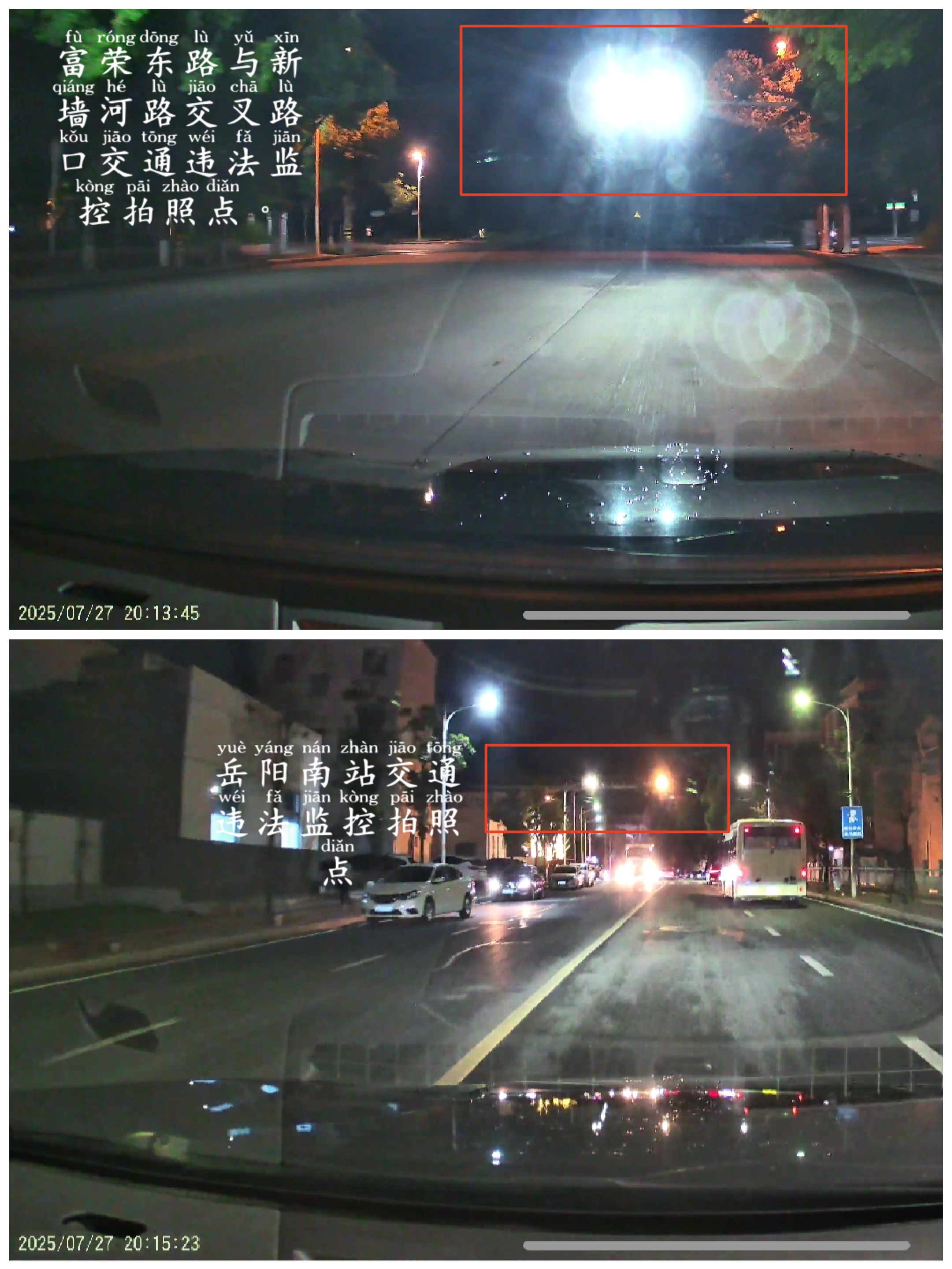 富荣东路与新墙河路交叉路口,交通违法拍照监控灯过于太亮,照射眼睛,容易导致驾驶员眼睛出现眩光,易发生交通事故。请把这个交通警察违法拍照点,进行优化或者把灯光调暗一点,在附件中上传了,另一处,岳阳南站交通违法监控灯的亮度是眼睛正常范围可以接受的。